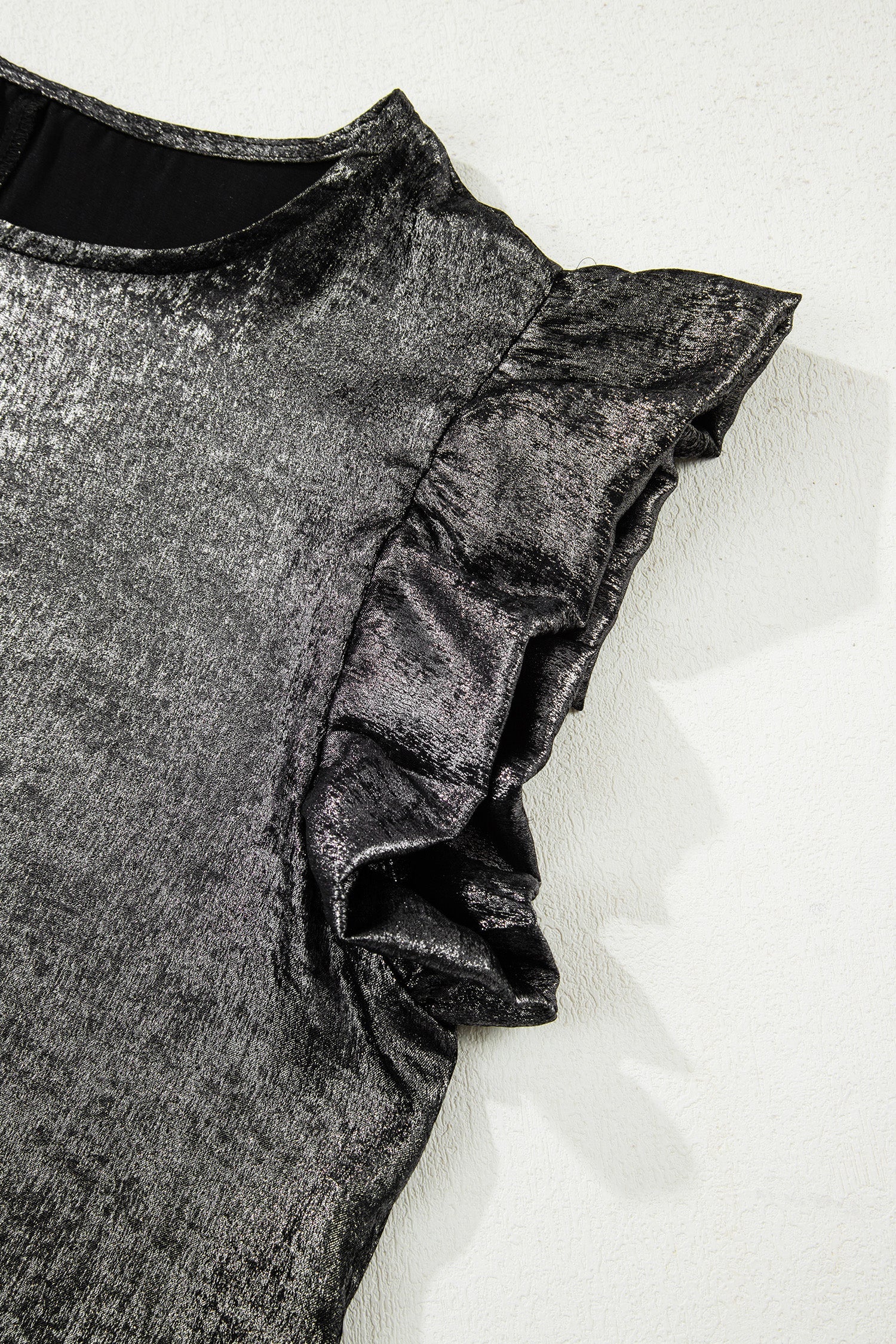 Step into Amelia Ruffle Trim Sleeveless Top for an effortless look that feels as good as it looks. Shimmering metallic top adds a bold, party-ready shine. Ruffle trim detail creates a soft, feminine finish. Round neck silhouette offers classic, easy styling. Sleeveless design keeps you cool and comfortable. Womens tank tops pair perfectly with skirts, trousers and dressy denim.