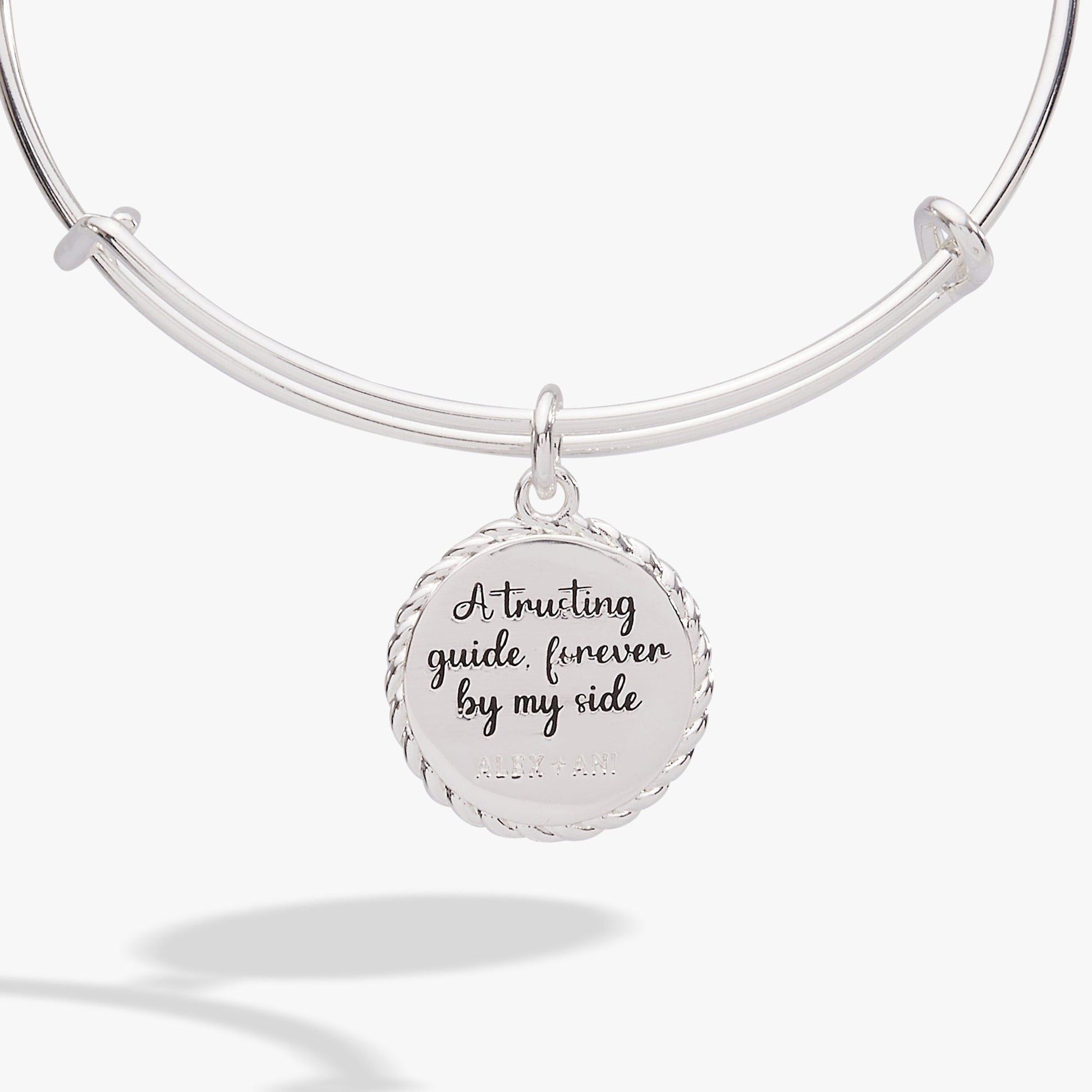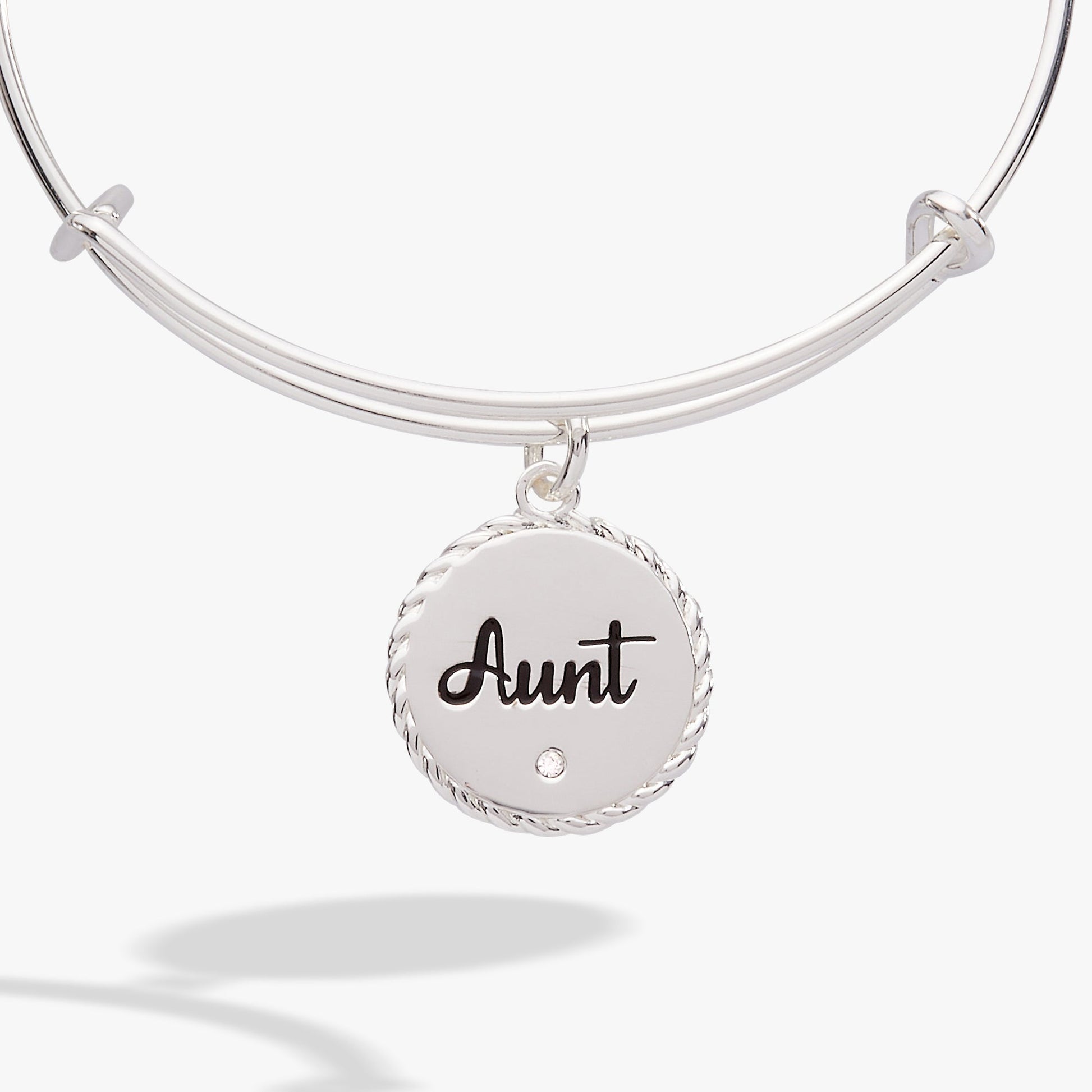 Celebrate the special bond you share with your favorite aunt with this charming bangle featuring an "Aunt" charm and distinctive rope edge texture. The front showcases the meaningful word that captures her role in your life, while the back is engraved with the heartfelt phrase "A trusting guide forever by my side"—a beautiful reminder of her unwavering support and guidance. Perfect for gifting or treating yourself, this playful yet sentimental piece adds a touch of warmth to any jewelry collection. Stack it with other bangles for a personalized look that tells your unique story.