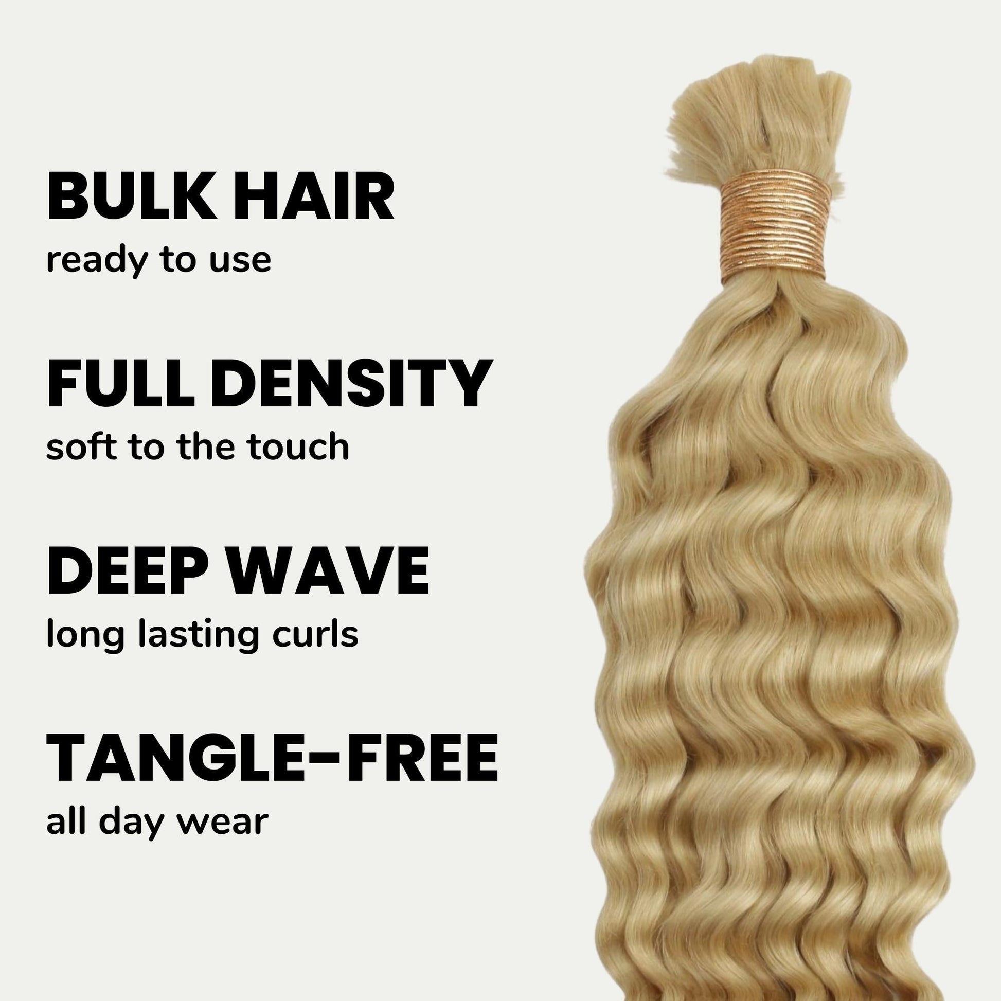 From the braid shop to the boardwalk, your hair will speak volumes before you say a word. Our Blonde Deep Wave Bulk Hair is your new must-have for adding glow, glam, and golden goddess energy to every look.