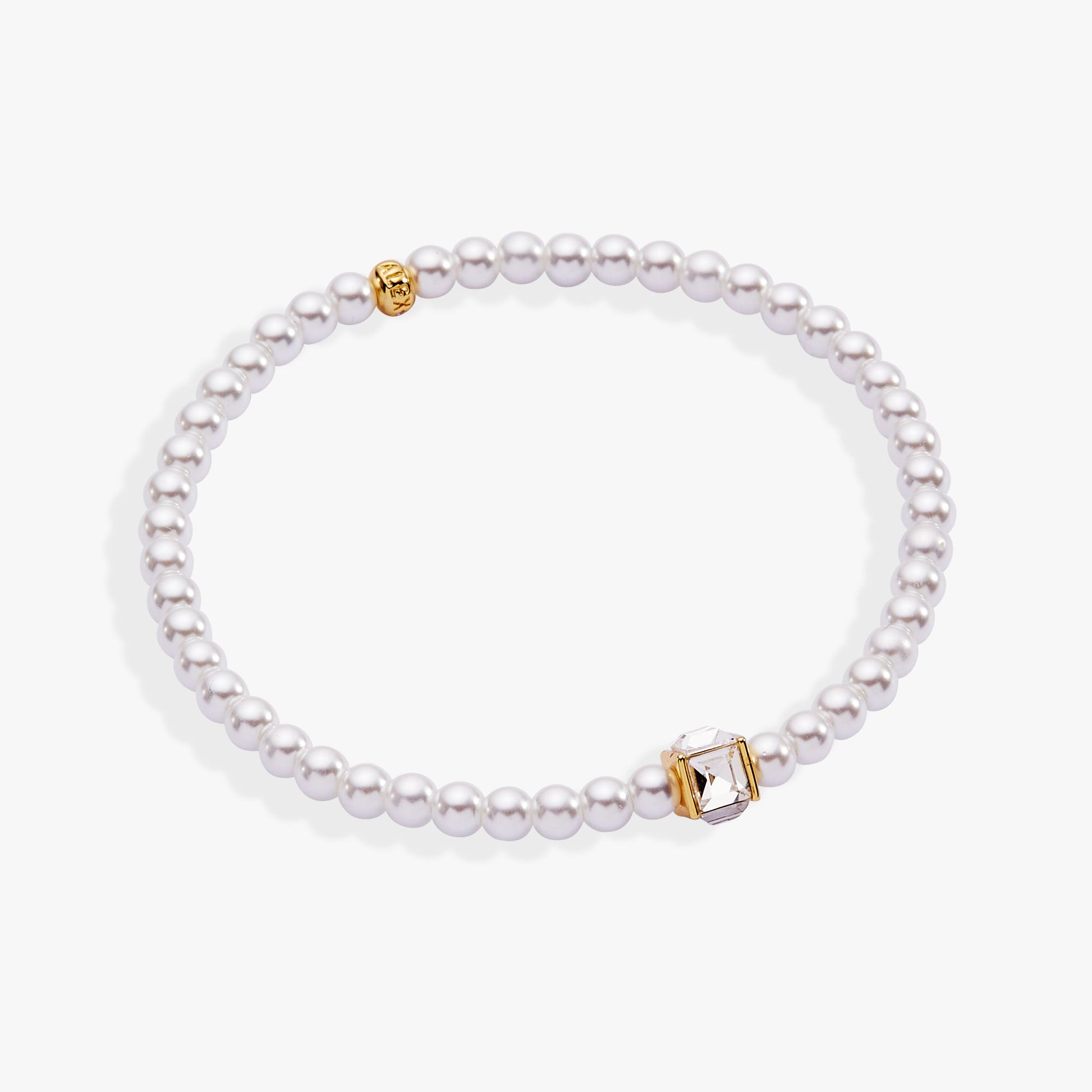 Elevate your everyday style with this charming stretch bracelet that effortlessly transitions from day to night. Featuring lustrous white faux pearl beads paired with a sparkling clear crystal square cube, this piece delivers just the right amount of shimmer without overwhelming your wrist. The gold plating adds warmth and sophistication, making it versatile enough to wear solo or layer with your favorite bracelets for a personalized look. This thoughtfully designed bracelet combines timeless elegance with modern flair. Whether you're dressing up for a special occasion or adding a touch of polish to your casual wardrobe, this stretch bracelet is your go-to accessory for creating effortless, radiant combinations.