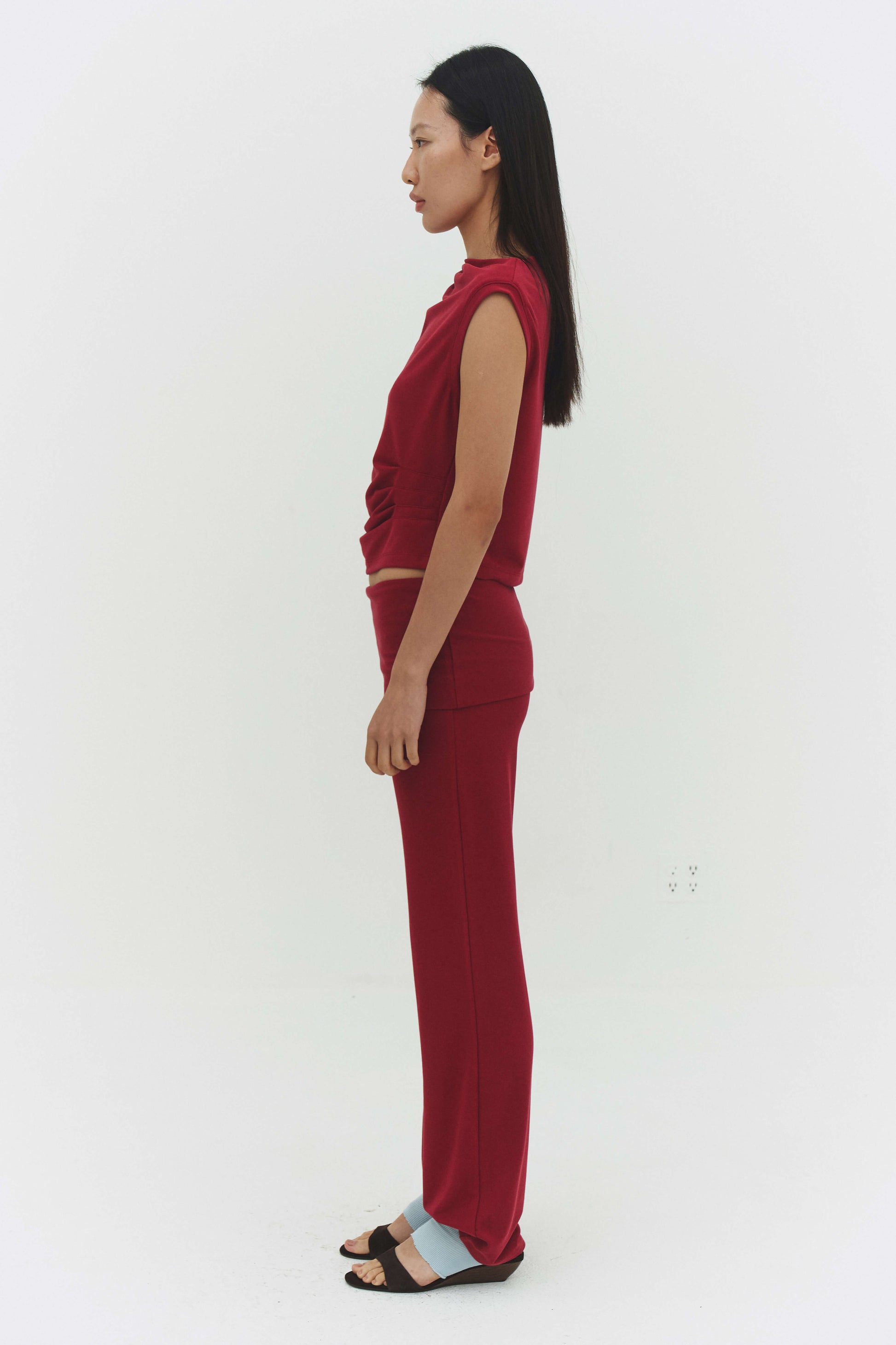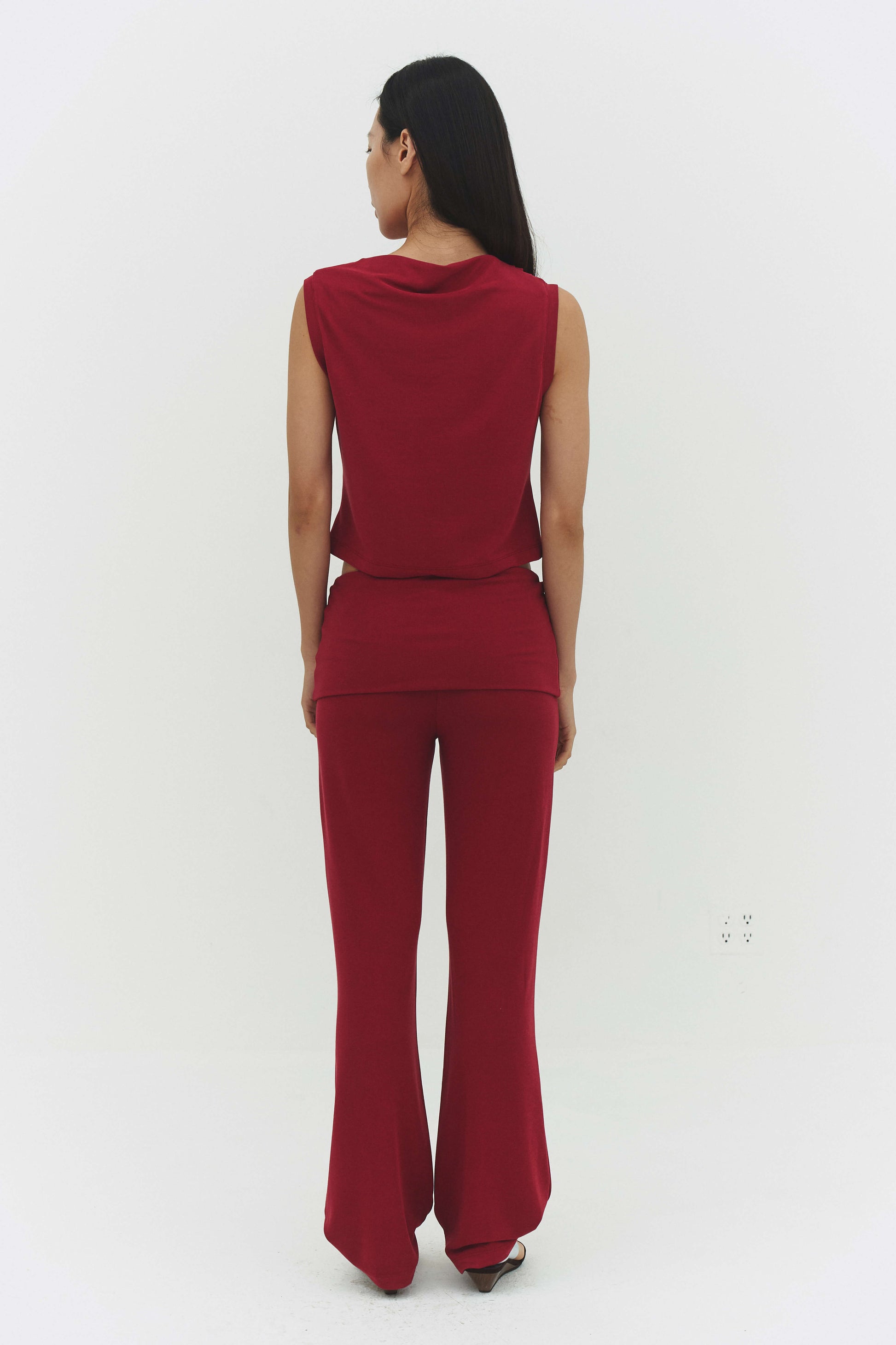 The Dasom Tank Top is a sleeveless crop with draped cowl neckline and ruched side detailing. Pairs perfectly with the matching pants.