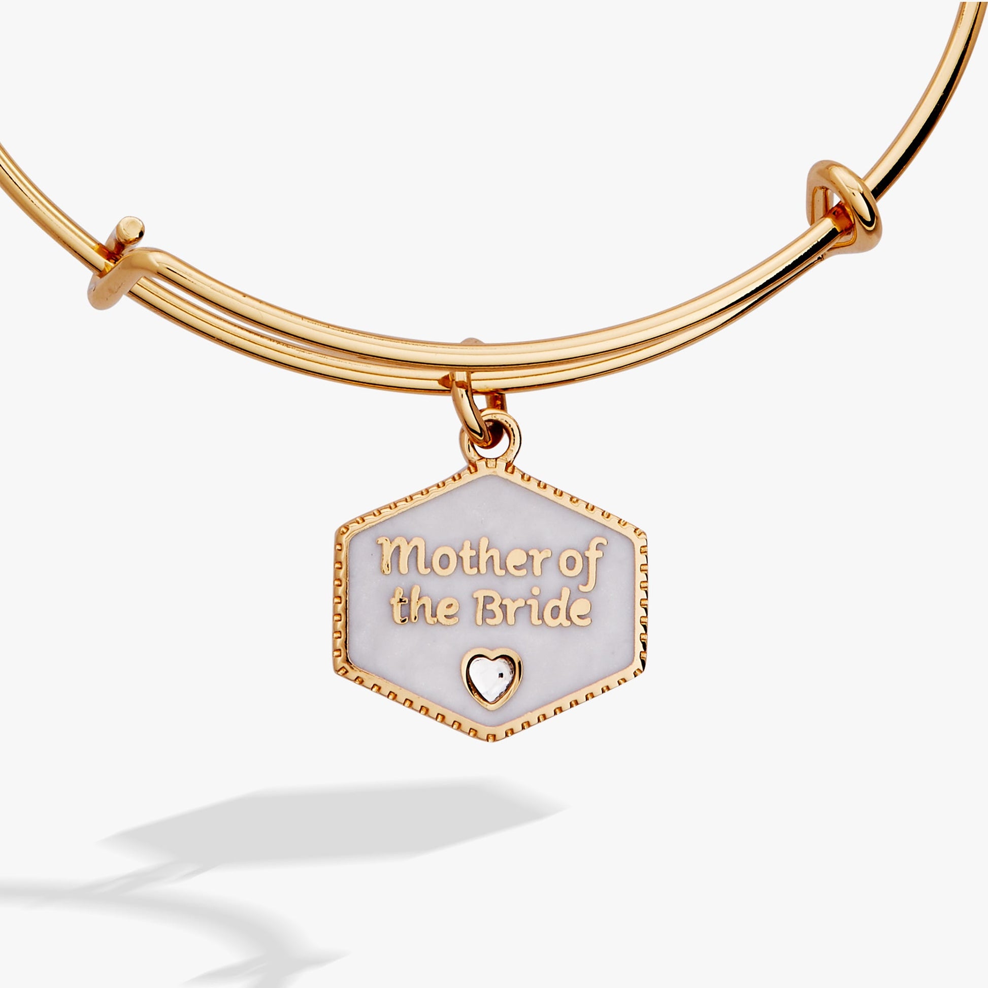 Honor mom with this stunning expandable bangle that proudly declares "Mother of the Bride." Crafted with iridescent pearlized enamel, a textured border for added dimension, and topped with a glittering crystal heart stone—because every mother deserves to shine on the big day.