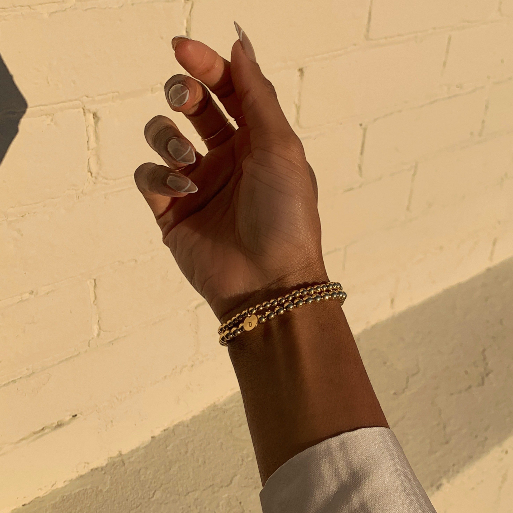 4mm 14k gold filled bead bracelet on stretch cord with a 14k gold filled disc, engraved with your custom initial. made in the usa.