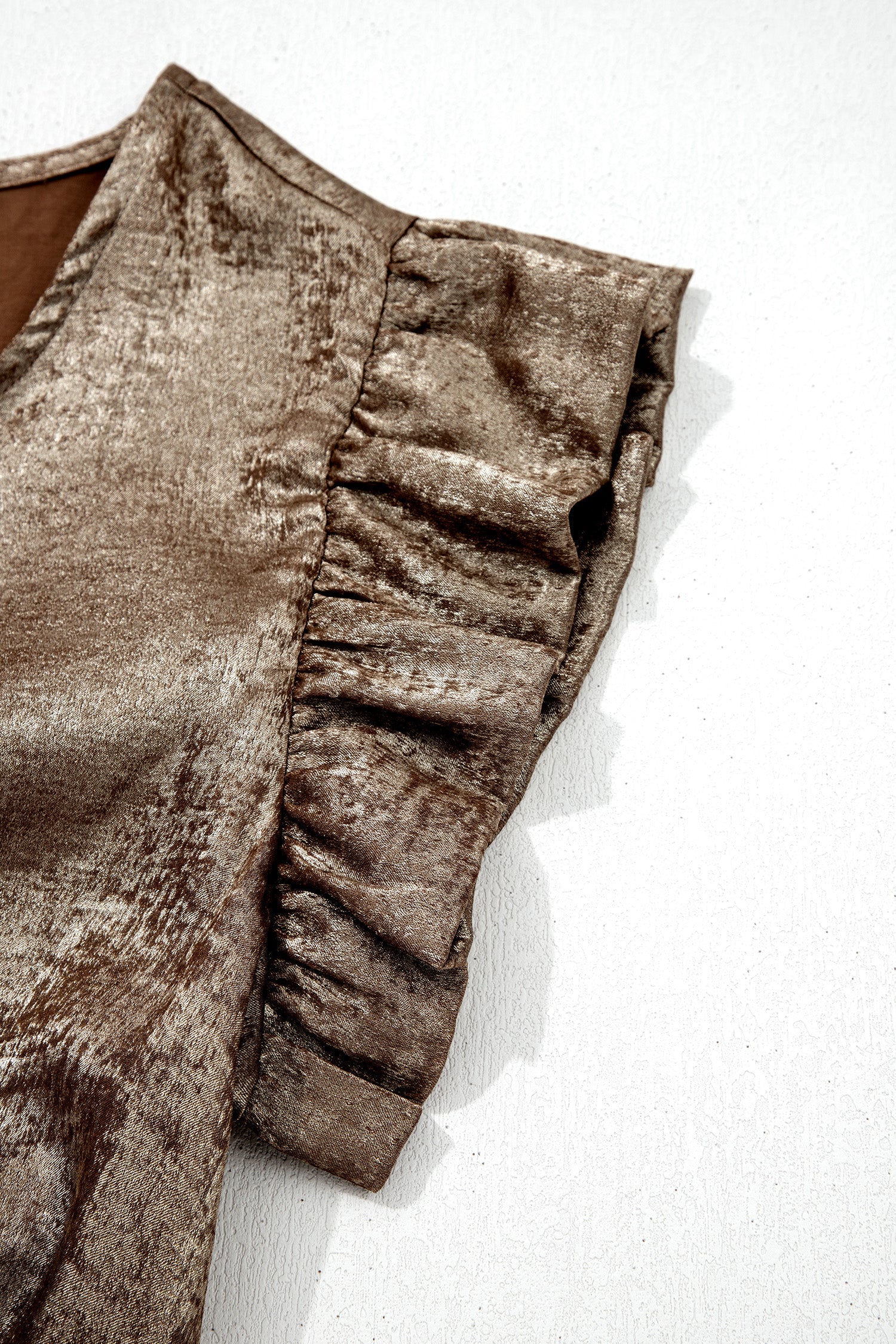 Introducing Parker Ruffle Trim Sleeveless Top—the perfect blend of casual comfort and put-together style. Shimmering metallic top adds a bold, party-ready shine. Ruffle trim detail creates a soft, feminine finish. Round neck silhouette offers classic, easy styling. Sleeveless design keeps you cool and comfortable. Womens tank tops pair perfectly with skirts, trousers and dressy denim.