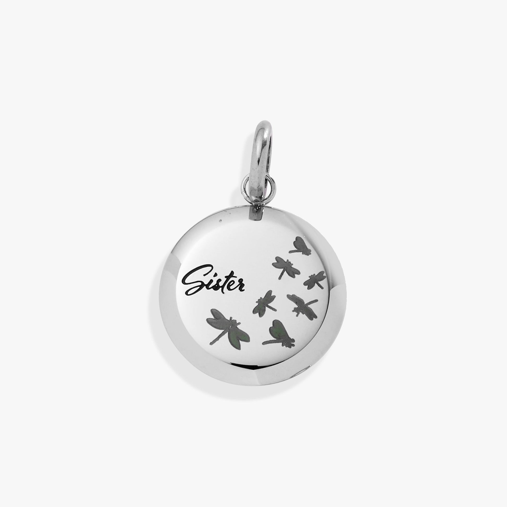 Celebrate the bond you share with this enchanting Sister charm, adorned with delicate dragonfly etchings that catch the light beautifully. Flip it over to discover an inspiring message: "Side by side or miles apart, family will always be connected by heart." A meaningful reminder that love transcends distance, this interchangeable charm transforms your bracelet or necklace into a personal keepsake that honors the special woman in your life.