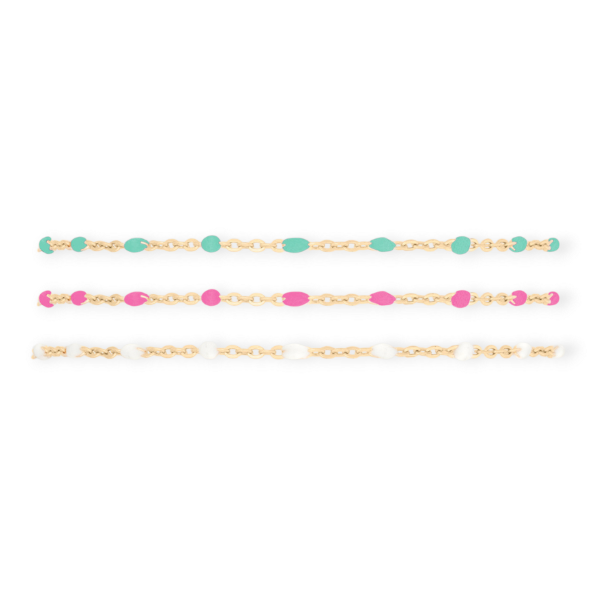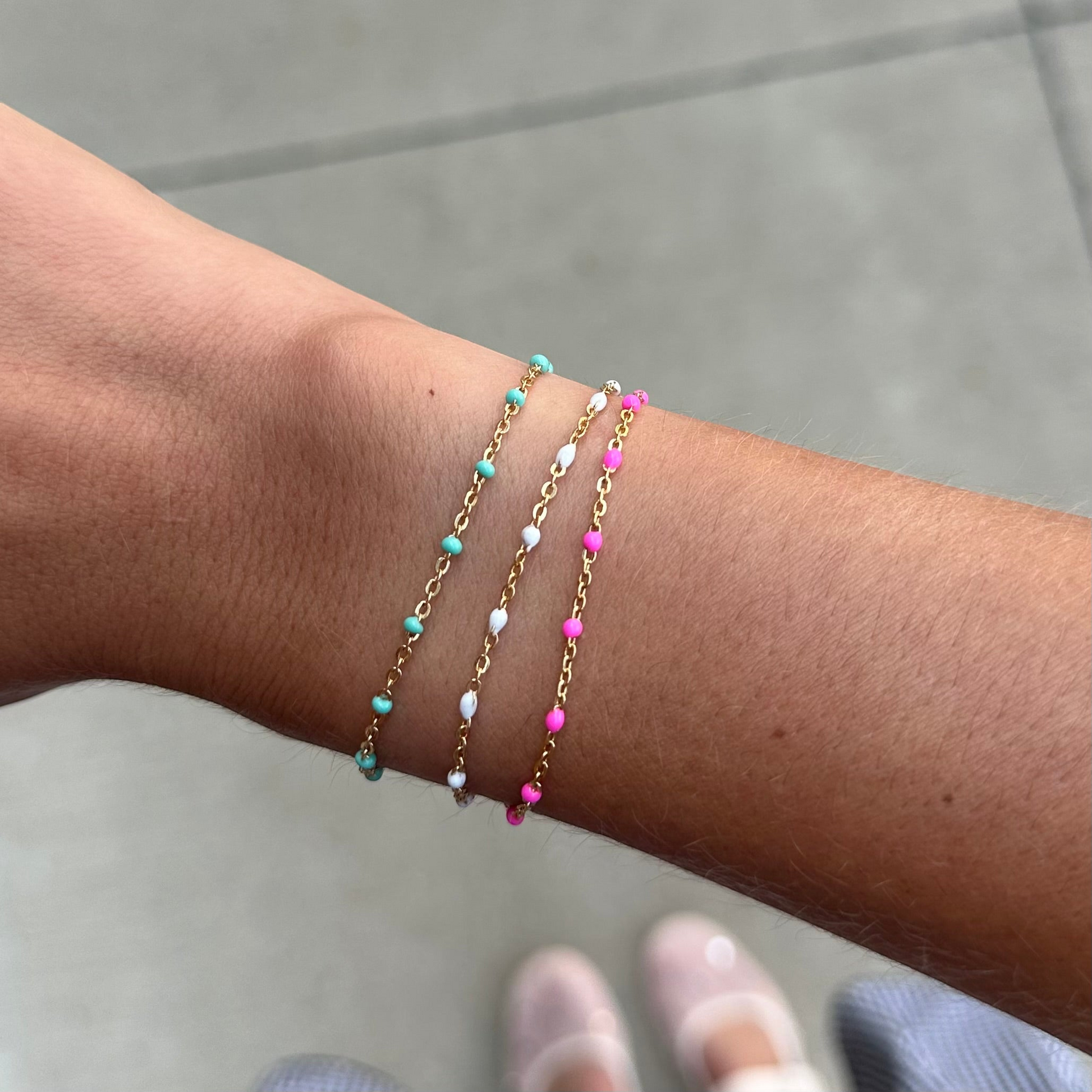 for our colorful daisy bracelet lovers, the ultimate cute colorful stack. our turquoise, pink, and white daisy bracelets stacked together. 14k gold filled chain. save 5% when you purchase as a stack. handmade in the usa.